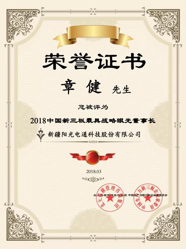 熱烈慶祝新疆陽光電通科技股份有限公司被評選為“2018中國新三板未來之星”!我公司在政府的大力扶持下,在新老客戶的支持和厚愛下,公司發(fā)展規(guī)模不斷壯大,實力與日俱增!公司的業(yè)績及口碑也連年獲得業(yè)界的一致肯定及好評!值此開懷之際,公司董事長章健先生及公司全體員工感謝新老客戶對我公司的充分肯定及大力支持,我們將繼續(xù)奮勇向前,不辜負新老客戶的支持和厚愛!一路走來,感謝有您相伴!